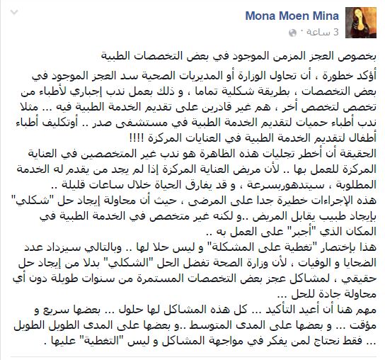 وضربت مثالا- عبر منشور لها على “فيسبوك”- “مثلا ندب أطباء حميات لتقديم الخدمة الطبية في مستشفى صدر .. أو تكليف أطباء أطفال لتقديم الخدمة الطبية في العنايات المركزة !!!!“.