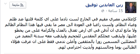وقال الإعلامي بقناة الجزيرة “زين العابدين توفيق” ، كإعلامي مصري مقيم في الخارج لست نادمًا على اي كلمة قلتها ضد ظلم وغباء النظام ، مضيفًا :”لست راغبًا في العودة الى مصر ما بقي فيها هذا النظام الظالم، ولا مانع لدي أن أدفن في أي أرض تغدق بالعدل والكرامة على من يخطو عليها”.