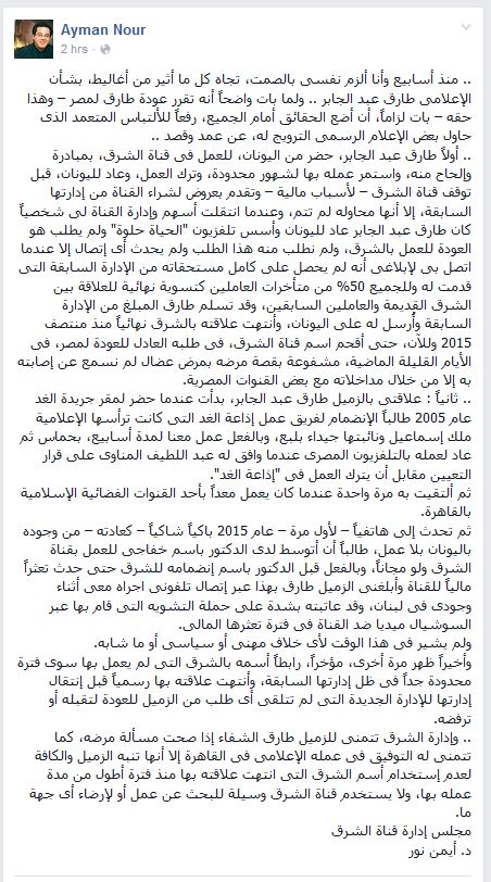 وأضاف نور: “وعندما انتقلت أسهم وإدارة القناة لي شخصيًا كان طارق عبد الجابر عاد لليونان، وأسس تلفزيون “الحياة حلوة”، ولم يطلب هو العودة للعمل بالشرق، ولم نطلب منه هذا الطلب ولم يحدث أي اتصال إلا عندما اتصل بي لإبلاغي أنه لم يحصل على كامل مستحقاته من الإدارة السابقة التي قدمت له وللجميع 50% من متأخرات العاملين كتسوية نهائية للعلاقة بين الشرق القديمة والعاملين السابقين، وقد تسلم طارق المبلغ من الإدارة السابقة وأُرسل له على اليونان، وانتهت علاقته بالشرق نهائيًا منذ منتصف 2015م وللآن.