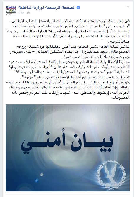 وكانت وزارة الداخلية قد أعلنت أمس أنها تمكنت من تصفية عدد من الأفراد أثناء محاولة استيقافهم بتهمة قتل ريجيني.