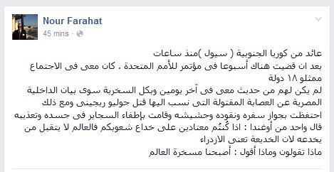 وأوضح “فرحات”، أنه كان في كوريا الجنوبية في مؤتمر تابع للأمم المتحدة أثناء إعلان البيان، وأكد أن هذا البيان كان مجال سخرية أعضاء المؤتمر طوال اليومين الماضيين، مؤكدًا أننا أصبحنا مسخرة العالم.