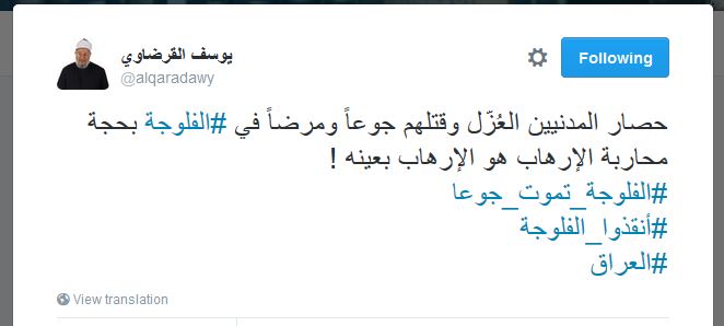 أدان الشيخ يوسف القرضاوي، الحصار الواقع على بلدة الفلوجة العراقية، وذلك خلال تغريدة نشرها عبر حسابه الشخصي بموقع التغريدات القصيرة "تويتر"