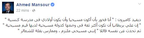 وأضاف منصور: “كاميرون في النهاية نصّب نفسه حاميًا للمسيحيين في العالم، وأخرج الصراع الذي يشعله إلى خارج بريطانيا”، حينما قال: “عندما نرى المسيحيين عام 2016 يتعرضون للاضطهاد بسبب معتقداتهم في دول أخرى في العالم، فيجب أن نتحدث بوضوح وأن نقف مع هؤلاء الذين يمارسون عقيدتهم بشجاعة”.