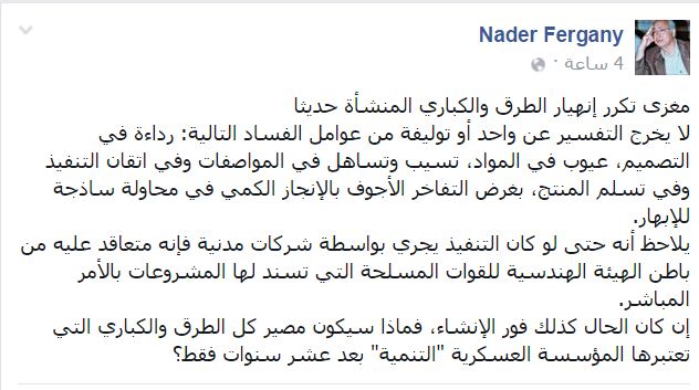 وتساءل -في ختام منشوره-: “إن كان الحال كذلك فور الإنشاء، فماذا سيكون مصير كل الطرق والكباري التي تعتبرها المؤسسة العسكرية “التنمية” بعد عشر سنوات فقط؟”.
