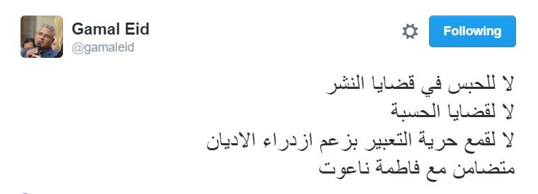 وأعرب الحقوقي جمال عيد، مدير الشبكة العربية لمعلومات الإنسان، عن تضامنه مع فاطمة ناعوت، قائلاً- عبر تغريدة على “تويتر”- “لا للحبس في قضايا النشر، لا لقضايا الحسبة، لا لقمع حرية التعبير بزعم ازدراء الأديان، متضامن مع فاطمة ناعوت”.