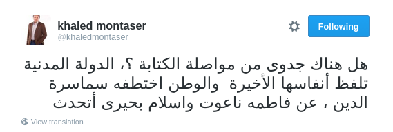 وقال- عبر تغريدة له على “تويتر”- “الدولة المدنية تلفظ أنفاسها الأخيرة والوطن اختطفه سماسرة الدين، عن فاطمه ناعوت وإسلام بحيري أتحدث“.
