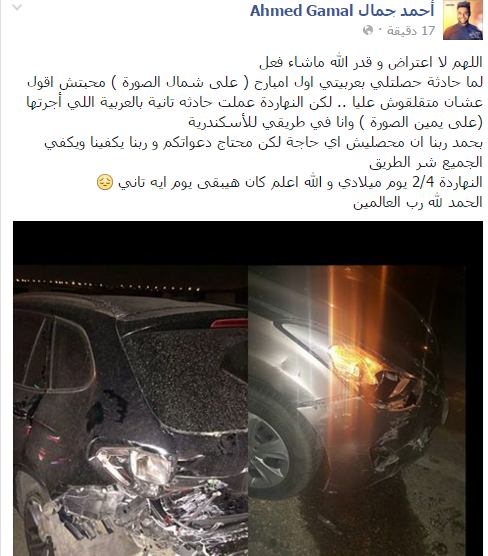 ونشر أحمد جمال صور السيارة المهشمة، قائلًا: “بحمد ربنا إن محصليش حاجة، لكن محتاج دعواتكم وربنا يكفينا ويكفي الجميع شر الطريق”.