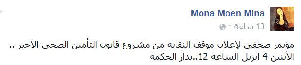 وقالت -عبر منشور لها على “فيس بوك”-: “مؤتمر صحفي لإعلان موقف النقابة من مشروع قانون التأمين الصحي الأخير.. الإثنين 4 إبريل الساعة 12.. بدار الحكمة”.