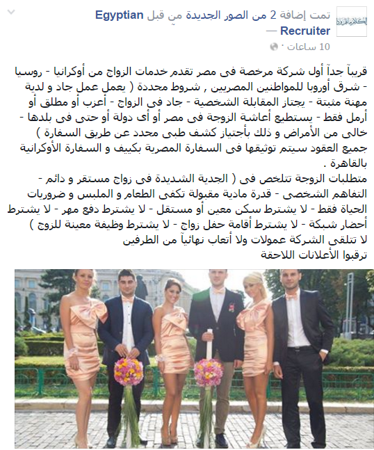 أعلنت صفحة "Egyptian Recruiter"، للخدمات الاحترافية، عن موافقة الحكومة على ترخيص أول شركة مصرية لتقديم خدمات الزواج للمصريين، من أوكرانيات، وروسيات، وفتيات من شرق أوروبا