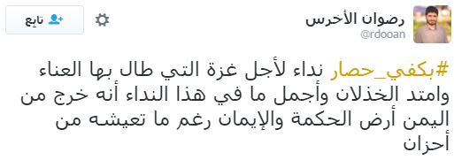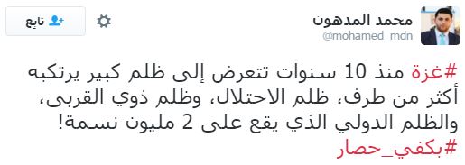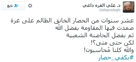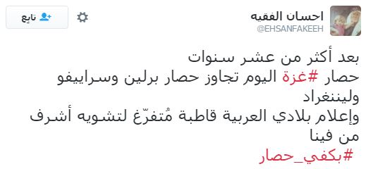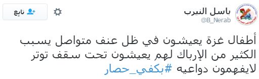 دشن رواد مواقع التواصل الاجتماعي "تويتر" هاشتاج تحت اسم "#بكفي_حصار"، للمطالبة بفك الحصار الإسرائيلي المفروض على قطاع غزة للعام العاشر على التوالي.