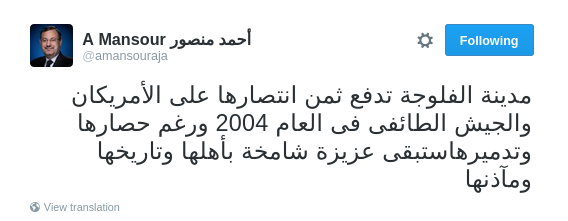 وقال -في تغريدة له على “تويتر”-: “مدينة الفلوجة تدفع ثمن انتصارها على الأميركان والجيش الطائفي في عام 2004، ورغم حصارها وتدميرها ستبقى عزيزة شامخة بأهلها وتاريخها ومآذنها”.