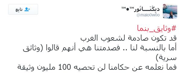 ‏maio: “قد تكون صادمة لشعوب الغرب، أما بالنسبة لنا.. فصدمتنا هي أنهم قالوا (وثائق سرية) فما نعلمه عن حكامنا لن تحصيه 100 مليون وثيقة”.