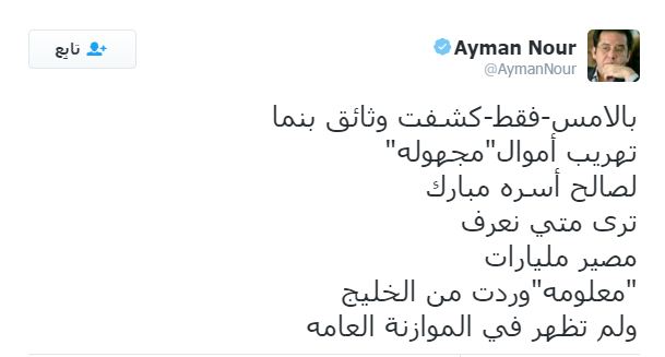 أيمن نور، رئيس حزب “غد الثورة”: “بالأمس -فقط- كشفت وثائق بنما تهريب أموال “مجهولة” لصالح أسرة مبارك، ترى متى نعرف مصير مليارات “معلومة” وردت من الخليج، ولم تظهر في الموازنة العامة”.