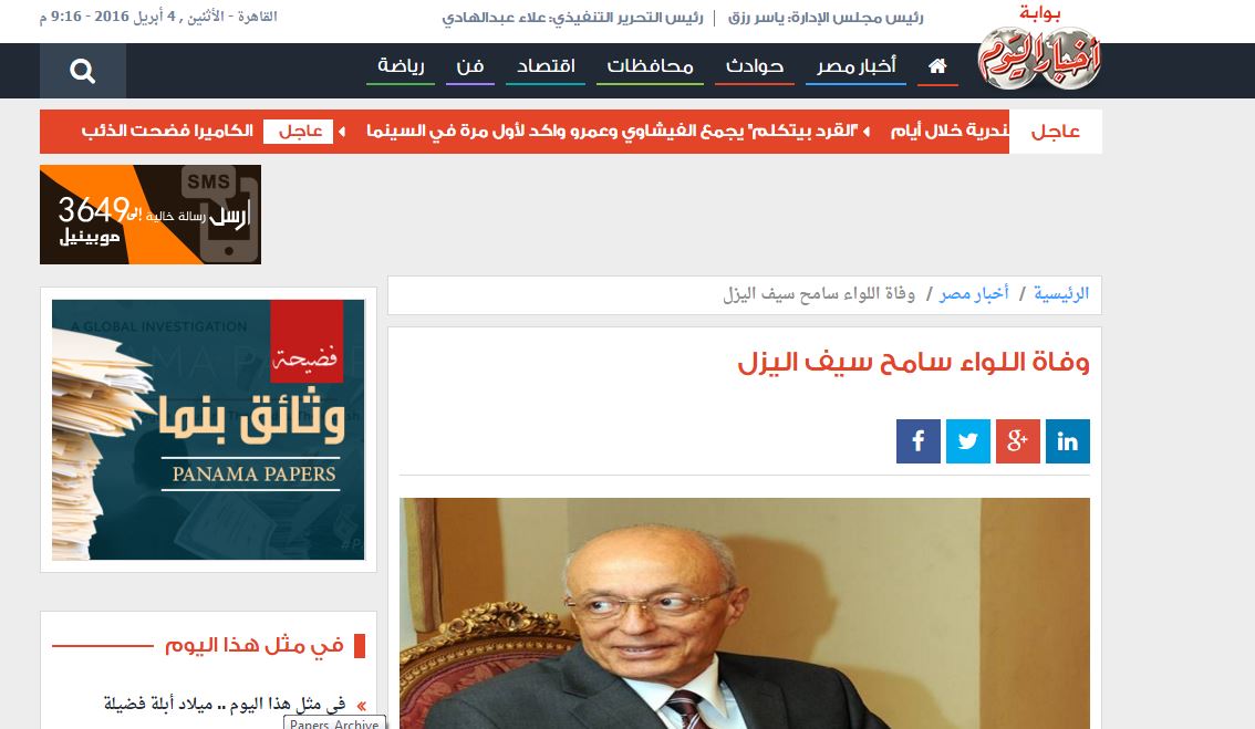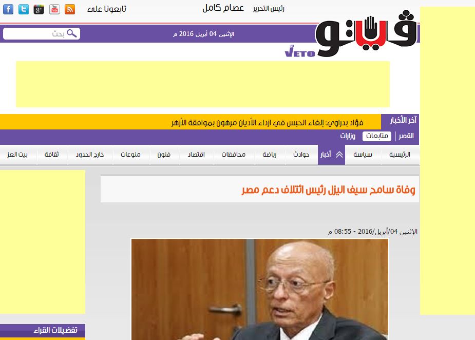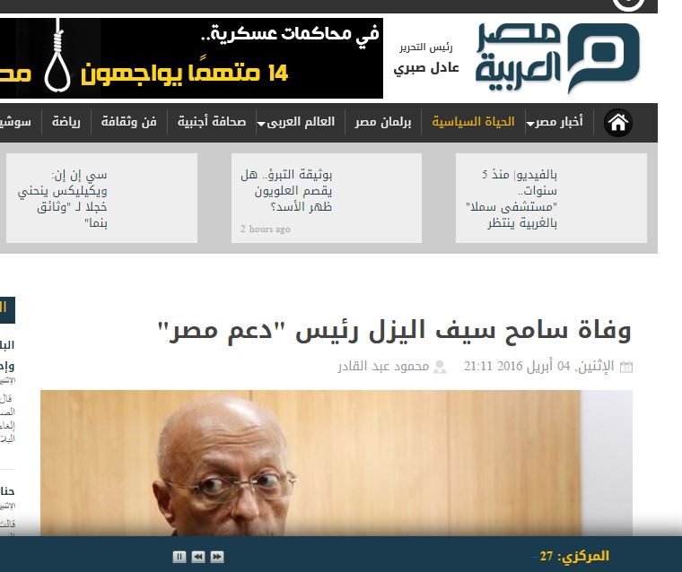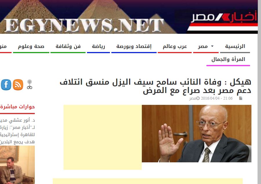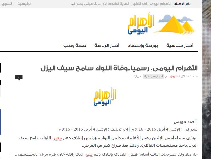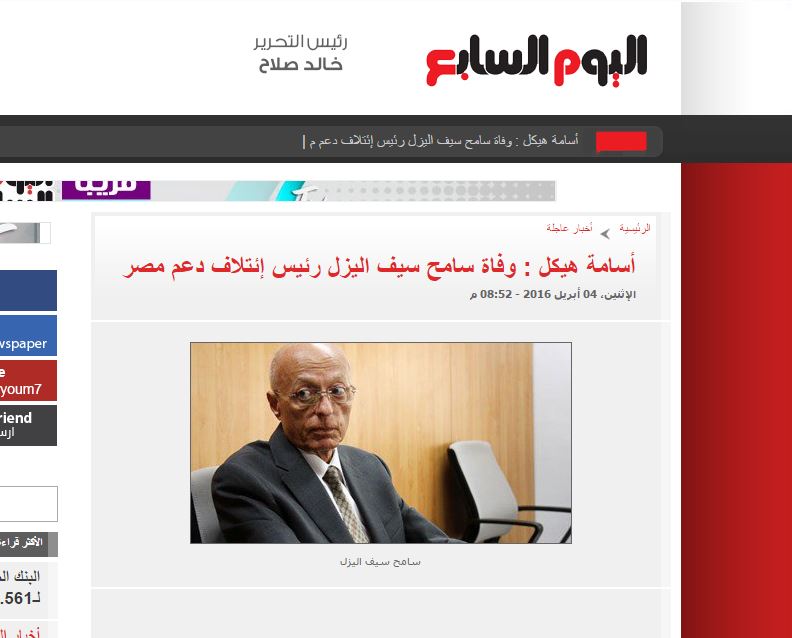 وفي ما يلي رصد لأبرز مانشتات الصحف والمواقع الإخبارية المصرية التي تناولت وفاة اللواء سامح سيف اليزل رئيس ائتلاف دعم مصر.
