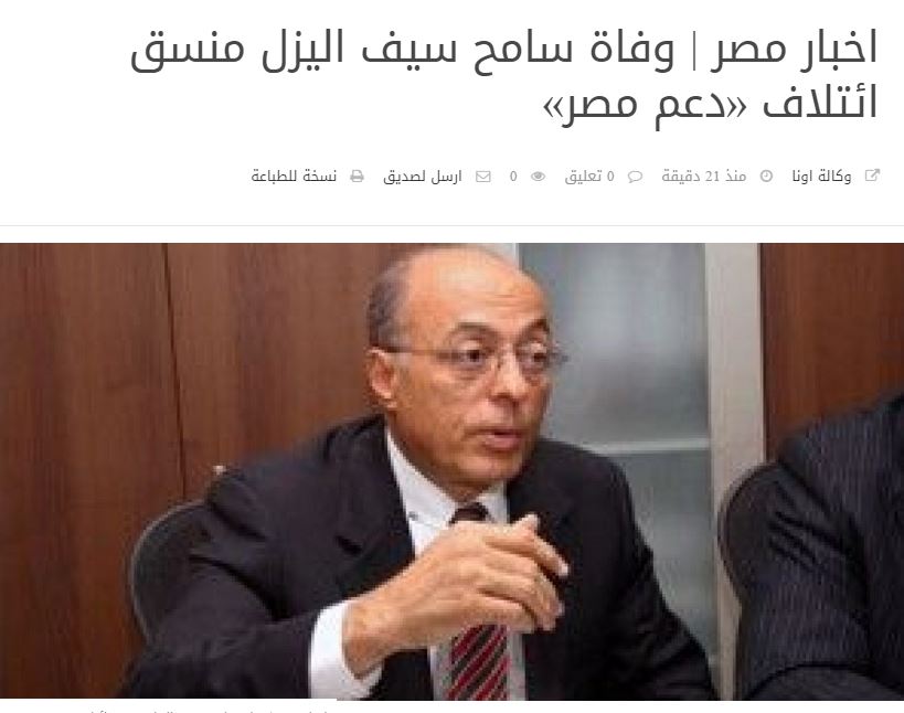 أعلن النائب أسامة هيكل نائب رئيس ائتلاف دعم مصر، أن اللواء سامح سيف اليزل رئيس الائتلاف توفي منذ قليل، بعد معاناة كبيرة مع المرض