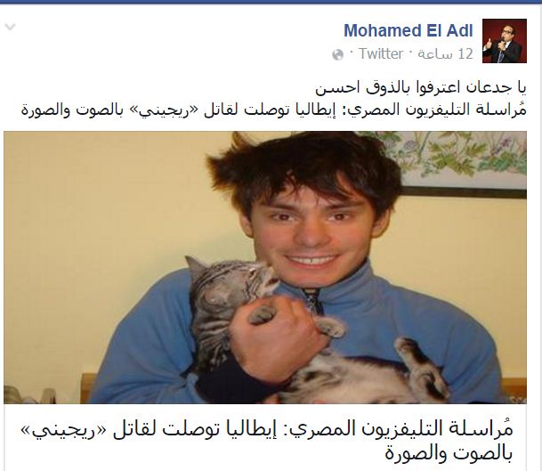 طالب المنتج محمد العدل، النظام المصري بالاعتراف بمقتل الطالب الإيطالي جوليو ريجيني، قبل أن تنكشف الحقائق؛ حيث قال -عبر منشور له على “فيس بوك”-: “يا جدعان اعترفوا بالذوق أحسن”، مضيفًا بنقل عنوان لأحد الأخبار “مُراسلة التليفزيون المصري: إيطاليا توصلت لقاتل “ريجيني” بالصوت والصورة”.