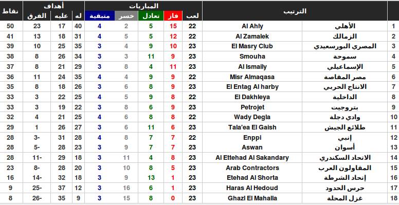 وحافظ الزمالك على ترتيبه في المركز الثاني برصيد 41 نقطة رغم خسارته في هذه الجولة من الإسماعيلي بهدف للاشيء، فيما يحتل نادي غزل المحلة في المركز الأخير برصيد ثماني نقاط.