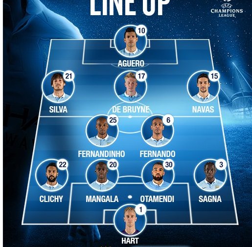 أعلن مانويل بيليجريني المدير الفني لنادي مانشستر سيتي الإنجليزي، تشكيلة فريقه الأساسية التي تخوض مواجهة فريق باريس سان جيرمان  في ذهاب الدور ربع النهائي لدوري أبطال أوروبا على ملعب بارك دي برانس.