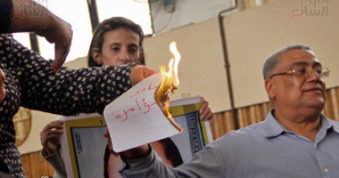أشعل عدد من أنصار الرئيس المخلوع حسني مبارك، النيران في لافتة كتبوا عليها “مؤامرة 25 يناير”، وسط هتافات “عاش البطل المحارب رافعين علامات النصر”.