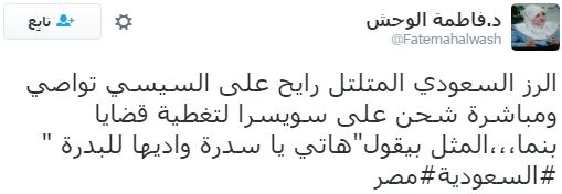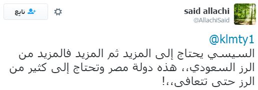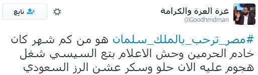 وجاءت الهاشتاجات، من قِبل المدونين السعوديين أو المصريين، للترحيب بالزيارة والتأكيد على عمق العلاقات بين البلدين، لكن التعليقات التي أشارت إلى المنح التي تقدمها المملكة لمصر، كانت الأكثر تداولا، وسيطرت كلمة “الأرز” على التعليقات، تذكيرًا بما قاله عبدالفتاح السيسي، سابقًا في أحد التسريبات، بأن “دول الخليج لديهم أموال زي الرز”.