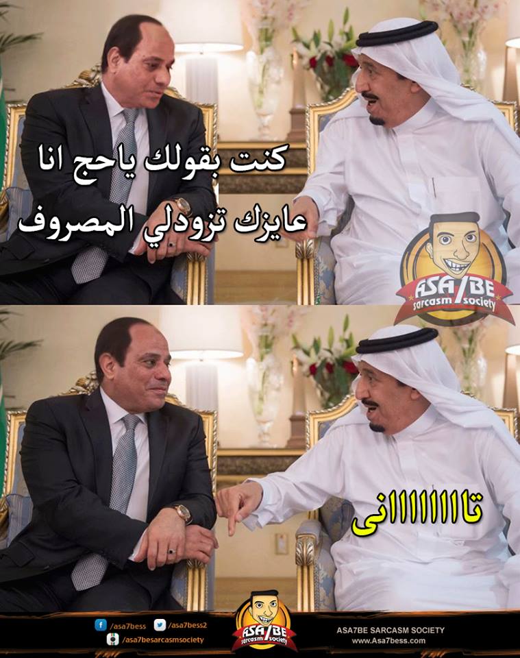 أما صفحة “أساحبي” فقد نشرت مقطعًا ساخرًا يتخيل فيه ردة فعل السيسي أثناء نزول الملك سلمان من سلم الطائرة عقب وصوله إلى القاهرة.