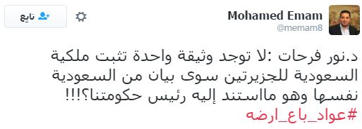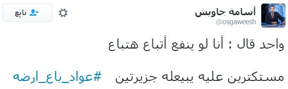 دشن رواد موقعي التواصل الاجتماعي “فيس بوك” و”تويتر” هاشتاجا تحت اسم”عواد باع أرضه”، ردا على بيان مجلس الوزراء المصري، الذي أكد أنّ رسم خط الحدود بناءً على المرسوم الملكي والقرار الجمهوري أسفر عن وقوع جزيرتي صنافير وتيران داخل المياه الإقليمية للمملكة العربية السعودية.
