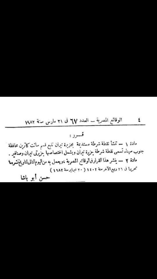 ونشرت جريدة الوقائع المصرية في ٢١ مارس عام ١٩٨٢، في عهد الرئيس المخلوع حسني مبارك، وتضمن مادتين؛ أولاهما: تنشأ نقطة شرطة مستديمة بجزيرة تيران تتبع قسم سانت كاترين لمحافظة جنوب سيناء تسمى نقطة شرطة جزيرة تيران ويشمل اختصاصها جزيرتي تيران وصنافير.