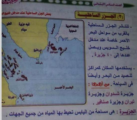 ويحتوي كتاب الدراسات للصف السادس الابتدائي للعام الدراسي الحالي درسا بعنوان “البيئة الساحلية في مصر”، وتضمن الجزر الساحلية بالبحر الأحمر في صفحة 23، وبينها جزيرتا “تيران وصنافير”، كأهم الجزر المصرية، ويستخدمها السكان كمراكز للصيد والسياحة.