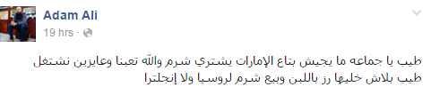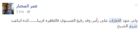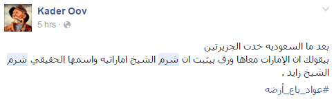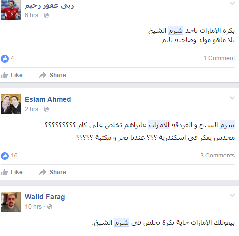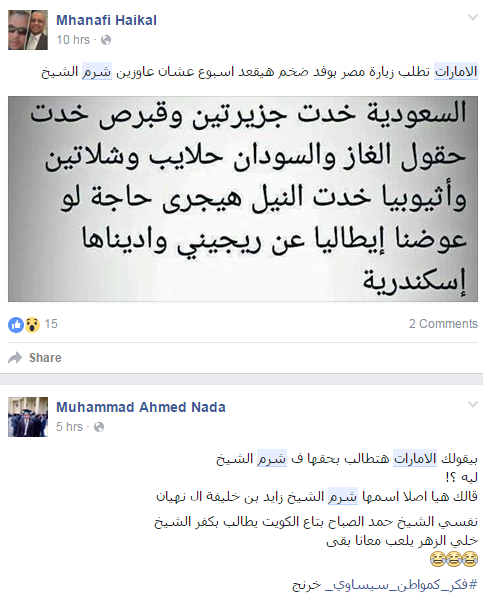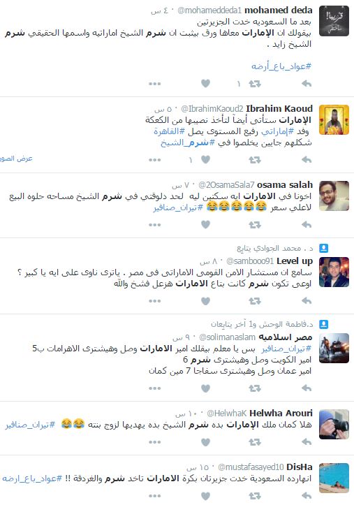 وربط الرواد تنازل مصر عن جزيرتي تيران وصنافير للسعودية بزيارة الوفد الإماراتي، وفي إطار من السخرية جاءت تعليقاتهم تشير إلى الخوف من تنازل الحكومة عن شرم الشيخ لهم.