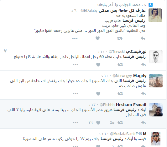 وعلى صعيد آخر، تناول مستخدمو مواقع التواصل الاجتماعي الزيارة المرتقبة للرئيس الفرنسي فرانسوا هولاند للقاهرة خلال الشهر الجاري؛ لمناقشة عدد من الاتفاقات التعاون بين البلدين المنتظر التوقيع عليها خلال الزيارة.