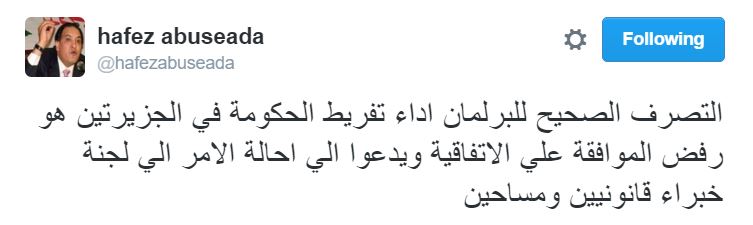 وقال -عبر تغريدة له على “تويتر”-: “التصرف الصحيح للبرلمان إزاء تفريط الحكومة في الجزيرتين هو رفض الموافقة على الاتفاقية والدعوة إلى إحالة الأمر إلى لجنة خبراء قانونيين ومساحين”.