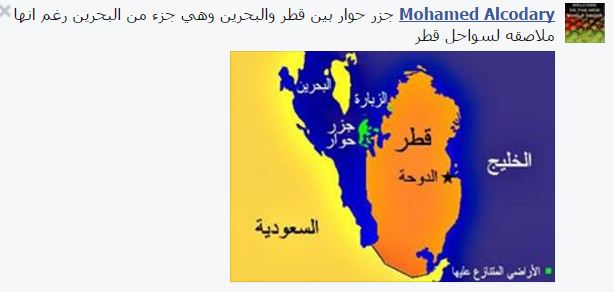 وعلق أحد متابعي صفحة “حسني” بصورة لجزر حوار، والتي تقع بين قطر والبحرين، وهي جزء من البحرين رغم أنها ملاصقة لسواحل قطر.