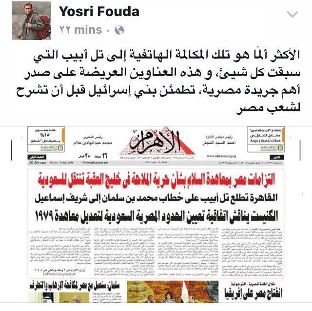 وعلق “فودة” على ما كتبته صحيفة “الأهرام” على صفحتها الرئيسية -عبر صفحته على “فيس بوك”- قائلًا: “الأكثر ألمًا هو تلك المكالمة الهاتفية إلى تل أبيب التي سبقت كل شيء، وهذه العناوين العريضة على صدر أهم جريدة مصرية، تطمئن بني إسرائيل قبل أن تشرح لشعب مصر”.