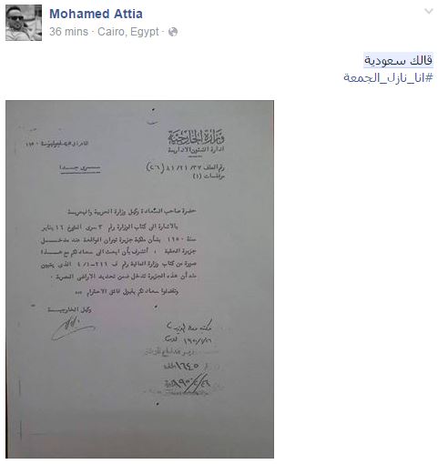 وعلّق عطية على الوثيقة قائلًا: “قالك سعودية، أنا نازل يوم الجمعة”، ولم يكن هذا أول تعليق من عطية على موضوع تنازل مصر عن الجزيرتين، فقد علّق سابقًا: “دلوقتي البلد بتتباع قدام عينك من النظام اللي إنت فضلت ساكت على جرايمه بحجة إنه بيحمي الأرض”.
