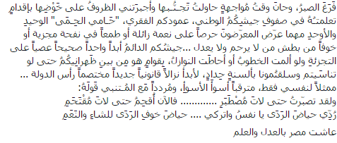 وتابع الضابطُ العاملُ بالجيشِ المصريِّ: أُشهدكم على نفسي أني قد اتخذت قراري بكامل إرادتي الحرة، وحيداً وحيداً وحيداً، دون تشجيع من فُلان أو تشاور مع علّان ولا متحيزاً لفئة، مدركاً كُـنه خصمي، عارفاً بحرج وظيفتي، موقناً “أن المتغطي بيكم *****” (آسف)، ملماً بعواقب فعلتي، ومقراً بأني خائف.. إن لم يكن على نفسي فقطعاً أخافُ على أسرتي.. لكن “مش هاروّح”.