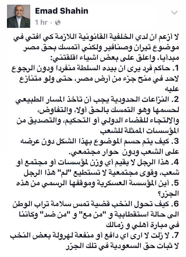 قال “شاهين” عبر منشور له على حسابه بموقع التواصل الاجتماعي “فيس بوك”: “لا أزعم أن لديّ الخلفية القانونية اللازمة كي أفتي في موضوع تيران وصنافير، ولكني أتمسك بحق مصر مبدئيا”.