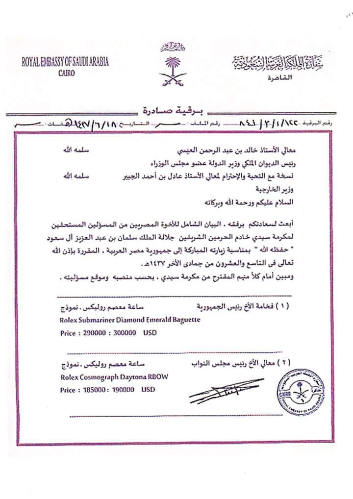 وبحسب المنشور، فإنه تم تقديم “ساعة رولكس” بقيمة 300 ألف دولار أميركي، إلى عبد الفتاح السيسي، وأخرى بقيمة 190 ألف دولار لرئيس مجلس النواب، الدكتور على عبد العال، ورئيس الوزراء المهندس شريف إسماعيل، وساعات ماركة “تبسوت” بقيمة 1500 دولار لعدد 508 نواب من الرجال، وماركة “بلوفا” بقيمة 4500 ريال سعودي لعدد 87 نائبة، إلى جانب تخصيص منح مالية للوزراء والصحفيين والعاملين بمؤسسة الرئاسة.