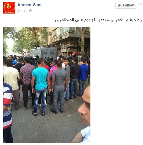 تداول عدد من رواد مواقع التواصل الاجتماعي صورة تُظهر عددا من الأشخاص تم وصفهم بالـ”بلطجية” يتحصنون خلف قوات الأمن التي حاصرت المتظاهرين في “جمعة الأرض والعرض” عند نقابة الصحفيين.