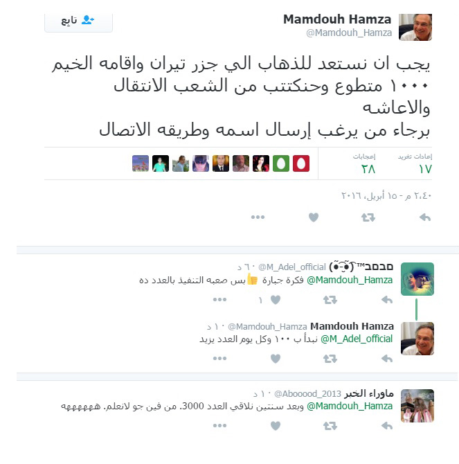 وقال “حمزة”: يجب أن نستعد للذهاب إلى جزر تيران وإقامة الخيم،، ١٠٠٠ متطوع، وحنكتتب من الشعب الانتقال والإعاشة، برجاء من يرغب إرسال اسمه وطريقة الاتصال..jpg)