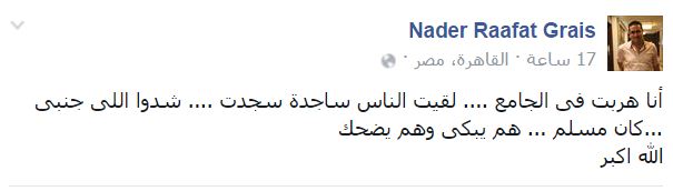 أكد نادر رفعت جريس “مسيحي”، أحد الشباب المتظاهرين في جمعة “الأرض والعرض”، أمس الجمعة، أنه دخل أحد المساجد، وسجد؛ حتى لا تلحق به قوات الأمن.