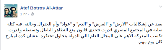 وقال -عبر تغريدة له على “تويتر”-: “بعيدًا عن إشكاليات “الأرض” و”العرض” و”الدم” و”عواد” وأم الجنرال وخالته، فيه كتلة صلبة في المجتمع المصري قدرت تتحدى قانون منع التظاهر الباطل وتسقطه وقدرت تكسب المعركة الأهم على المجال العام اللي الدولة بتحاول تحتكره، عشان كده امبارح كان يوم مهم”.