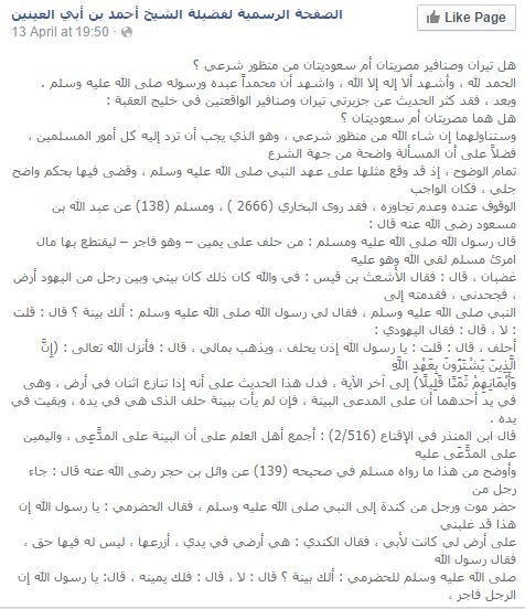 أما الصفحة الرسمية لفضيلة الشيخ أحمد بن أبي العينين فكان لها رأي آخر حول قضية تنازل السيسي عن جزيرتي تيران وصنافير لصالح السعودية مقابل حفنة من المساعدات مؤكدة تبعيتهما لمصر.