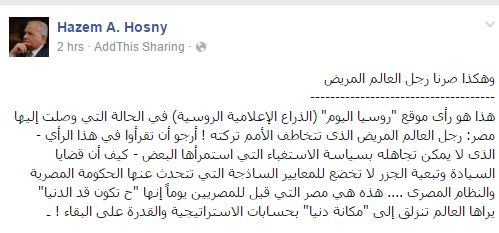وأضاف في منشور له عبر حسابه الرسمي على موقع “فيس بوك”: “هذا هو رأي موقع “روسيا اليوم” -الذراع الإعلامية الروسية- في الحالة التي وصلت إليها مصر: رجل العالم المريض الذي تتخاطف الأمم تركته! أرجو أن تقرؤوا في هذا الرأي الذي لا يمكن تجاهله بسياسة الاستغباء التي استمرأها البعض”.