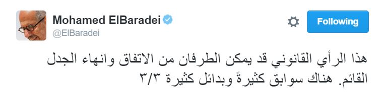 وأضاف “البرادعي”: “هذا الرأي القانوني قد يمكن الطرفين من الاتفاق وإنهاء الجدل القائم.. هناك سوابق كثيرة وبدائل كثيرة”.