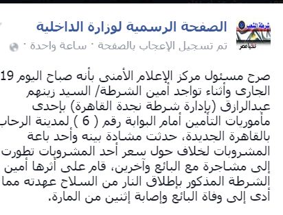 وجاء في البيان -الذي نشرته الوزارة عبر صفحتها الرسمية بموقع التواصل الاجتماعي “فيس بوك”-: “وصرح مسؤول مركز الإعلام الأمني، بأنه صباح اليوم 19 الجاري وأثناء حضور أمين الشرطة السيد زينهم عبدالرازق (بإدارة شرطة نجدة القاهرة) بإحدى مأموريات التأمين أمام البوابة رقم (6) لمدينة الرحاب بالقاهرة الجديدة، حدثت مشادة بينه وأحد باعة المشروبات لخلاف حول سعر أحد المشروبات”.