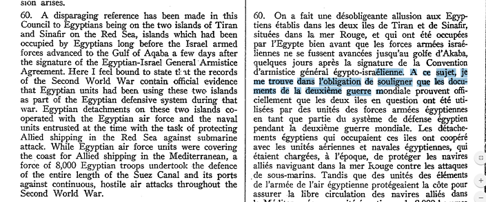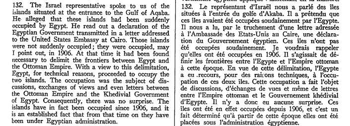 وفند السفير المصري الإدعاء الإسرائيلي باحتلال مصر المفاجئ للجزيرتين عام 1950، وأكد أن الجزيرتين تقعان تحت السيادة المصرية منذ عام 1906.