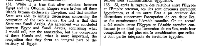 وأكد البند 133 على أن مصر اتفقت مع السعودية على احتلال الجزيرتين وأنهما يمثلان جزء لا يتجزأ من الأراضي المصرية، وقال السفير المصري: “أبرمت اتفاقية بين مصر والسعودية أكدت ما أسميه، ليس ضم وإنما احتلال الجزيرتين، والأهم من ذلك الاعتراف بأن الجزيرتين تمثلان جزء “لا يتجزأ من الأراضي المصرية.