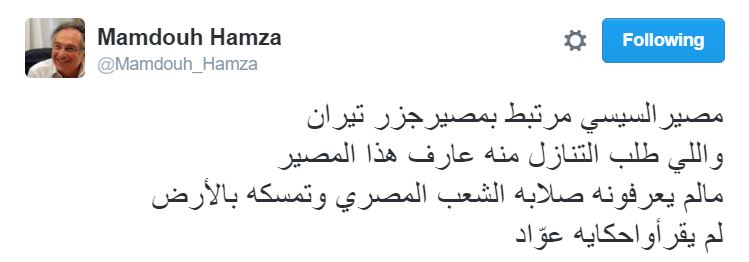وقال -عبر تغريدة له على”تويتر”-: “مصير السيسي مرتبط بمصير جزر تيران، واللي طلب التنازل منه عارف هذا المصير.. ما لم يعرفوه صلابة الشعب المصري وتمسكه بالأرض.. لم يقرؤوا حكاية عوّاد” .