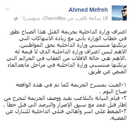 وأضاف مفرح: “الأهم ليس اعتراف وزارة الداخلية الذي لا قيمة له، ولكن الأهم هي حالة الإفلات من العقاب في الجرائم التي يرتكبها منتسبو وزارة الداخلية في مراحل ما بعد إلقاء القبض عن طريق: