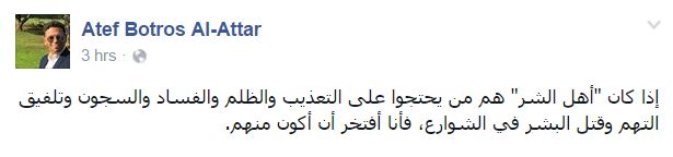 انتقد عاطف بطرس العطار، مؤسس مبادرة ميادين التحرير والمحاضر بجامعة هامبورج بألمانيا، وصف عبدالفتاح السيسي معارضي النظام بـ”أهل الشر”.